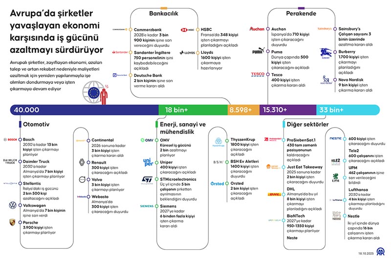 De ontslaggolf, die zich uitstrekt van de auto-industrie tot technologie, farmacie, luchtvaart, energie en bankwezen, toont aan hoe wankel de Europese arbeidsmarkt blijft in een periode van structurele onzekerheid.