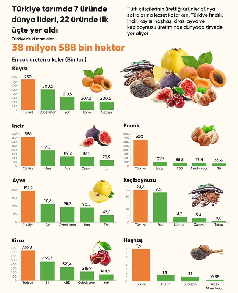 In de vijgenteelt blijft Turkije eveneens onbetwist marktleider met jaarlijks 350.000 ton, waarmee het land Egypte, Marokko, Algerije en Iran achter zich laat. De positie in de hazelnotensector is zelfs nog indrukwekkender: Turkije produceert jaarlijks 650.000 ton, goed voor meer dan de helft van de wereldwijde productie van 1,1 miljoen ton.