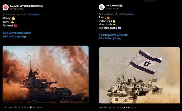 Er is op sociale media een opvallende woordenwisseling ontstaan tussen Turkije en Israël. Nadat het Turkse ministerie van Defensie op 26 december op platform X een ‘foto van de dag’ had gedeeld ter onderstreping van de militaire slagkracht, verscheen enkele uren later op het Turkstalige account van het Israëlische leger een vrijwel identiek bericht.