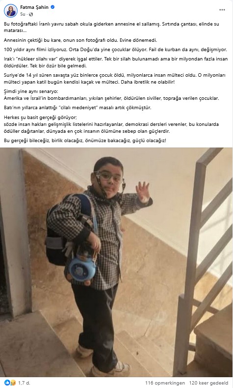 De burgemeester van de Turkse stad Gaziantep, Fatma Şahin, heeft op haar sociale media met meer dan 1,3 miljoen volgers een indringende boodschap gedeeld over het leed van kinderen in het Midden-Oosten. In haar bericht beschrijft zij een foto van een jonge Iraanse jongen die ’s ochtends naar school vertrekt en zijn moeder nog even gedag zwaait. Op zijn rug draagt hij een schooltas en in zijn hand een waterfles. De foto, gemaakt door zijn moeder, zou volgens Şahin het laatste beeld zijn dat zij van haar zoon heeft. Het kind kwam die dag om bij een luchtaanval.