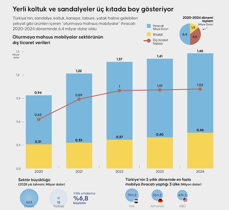 De Turkse meubelindustrie heeft de afgelopen vijf jaar een sterke exportprestatie neergezet. Tussen 2020 en 2024 werd voor in totaal 6,4 miljard dollar aan stoelen, fauteuils, banken, slaapbanken en aanverwante producten uitgevoerd. Irak, Duitsland en de Verenigde Staten waren de grootste afnemers.